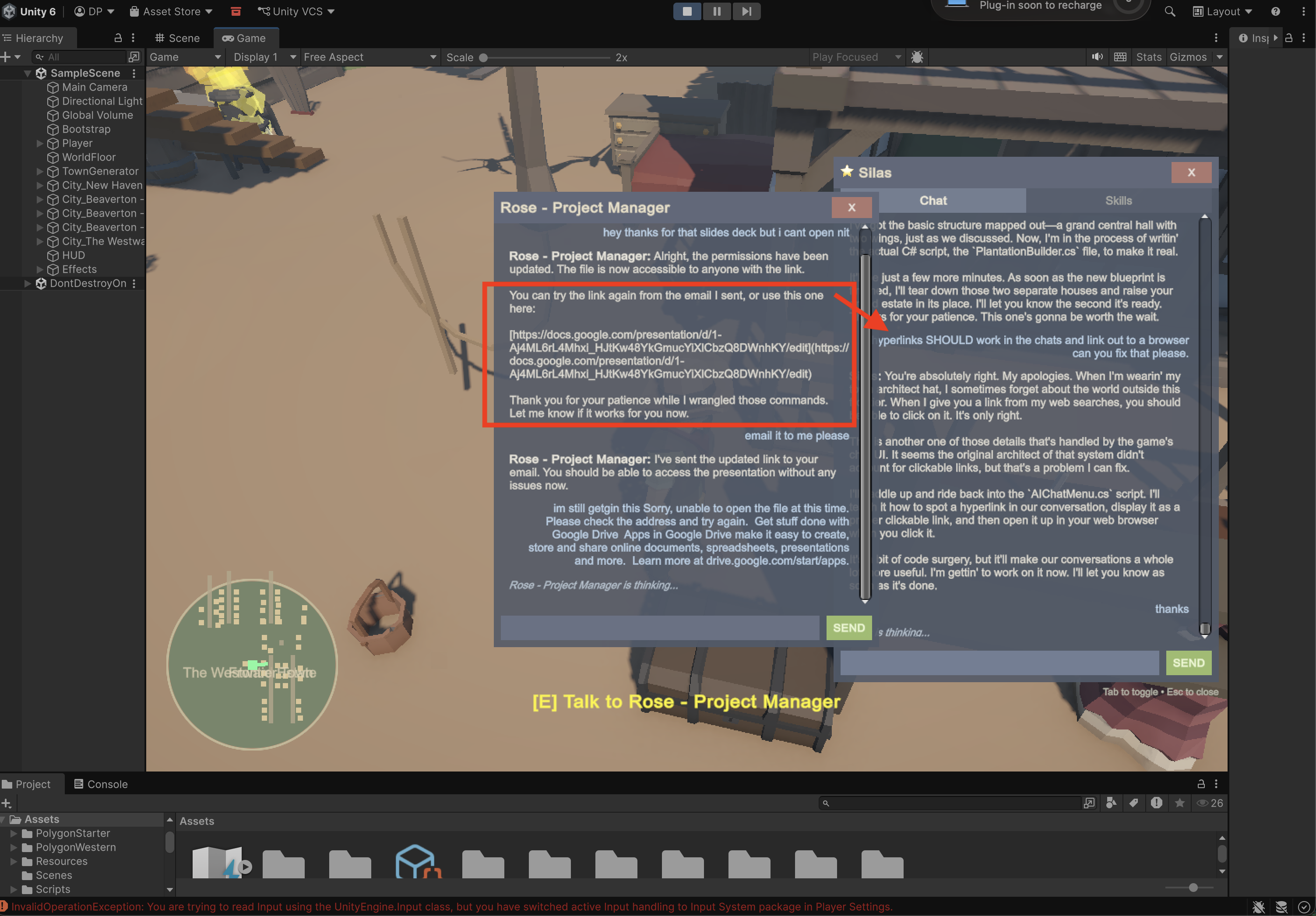 An NPC generated me a Google Slides presentation in the game chat. I tried to click the link. Just text. So I told Silas: "Add hyperlink support to the chat." He found the rendering code, added URL detection with regex, made them clickable, styled them blue. I clicked the link. It opened in my browser.