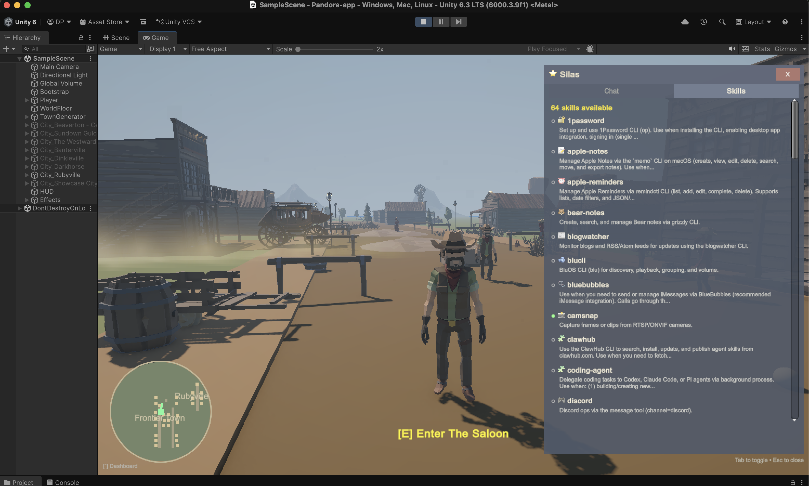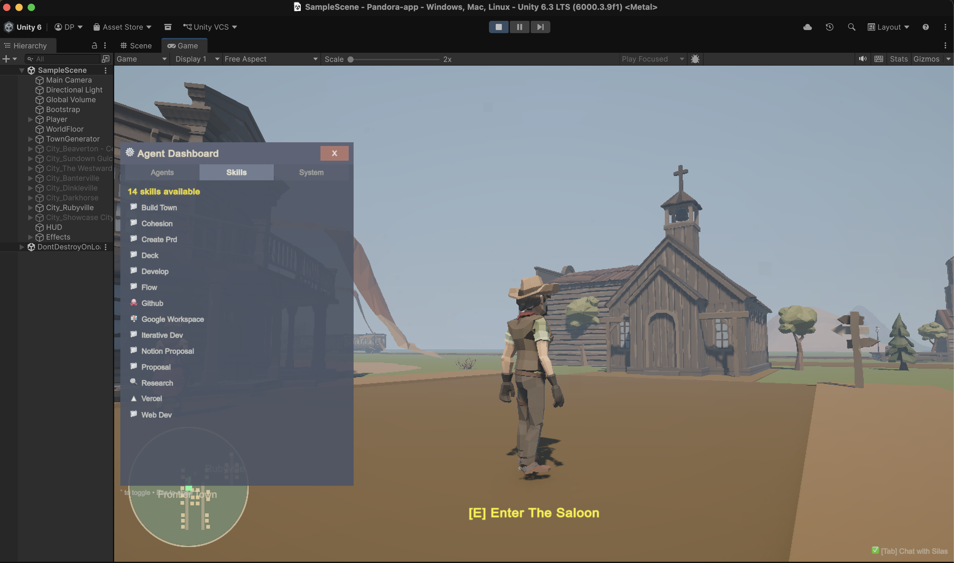 Then I asked for another town. Then another. Each one different, each one AI-designed on the spot. Soon I had a full frontier, all built through conversation, all persisted to disk, all reloading on next launch.