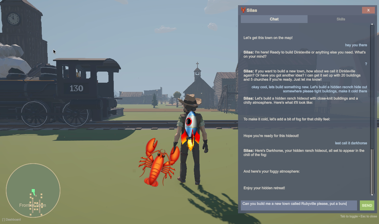 By Sunday night I had a 3D western frontier game where AI builds the world around me while I play, NPCs remember who I am across sessions, and a bartender named Mae deployed a Next.js app to Vercel and sent me the live link. In a game. Set in 1887.
